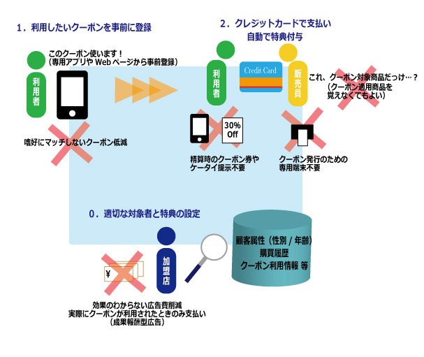 サービスに合意した利用者は、過去のクレジットカード利用履歴などからお勧めされたクーポンを専用アプリもしくはWebページ等で予め利用宣言しておきます。その後、加盟店でクレジットカードを用いて該当商品を購入すると、自動的に特典が適用されるという仕組みです。