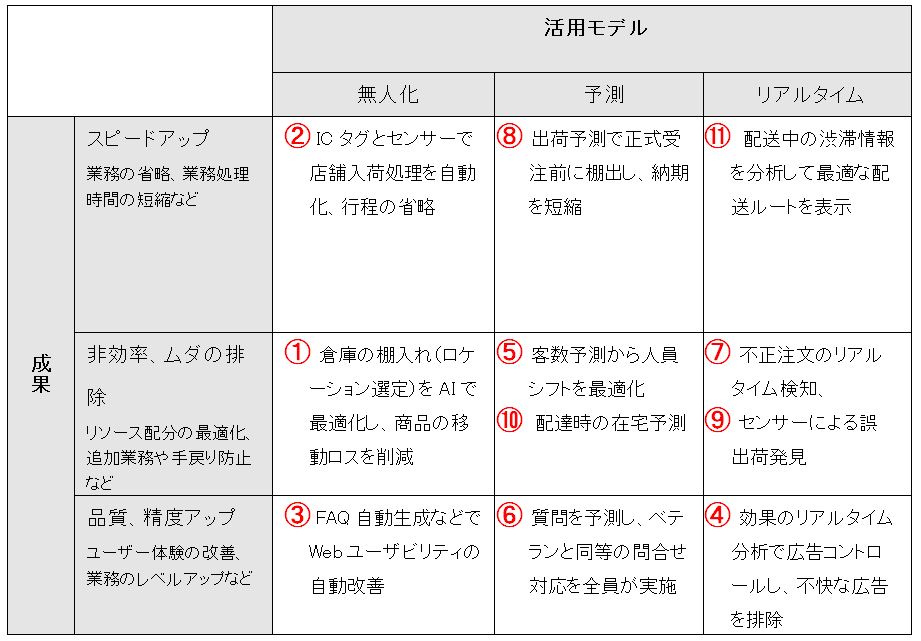 活用モデルを表すキーワードとして、「無人化」「予測」「リアルタイム」などが挙げられますが、この“成果”と“活用モデル”とでマトリクスを作り、アイディアで埋めていくと良いでしょう。手順をイメージしやすいように、下記の業務フロー(例)についてマトリクスを作り、アイディアを出してみました。